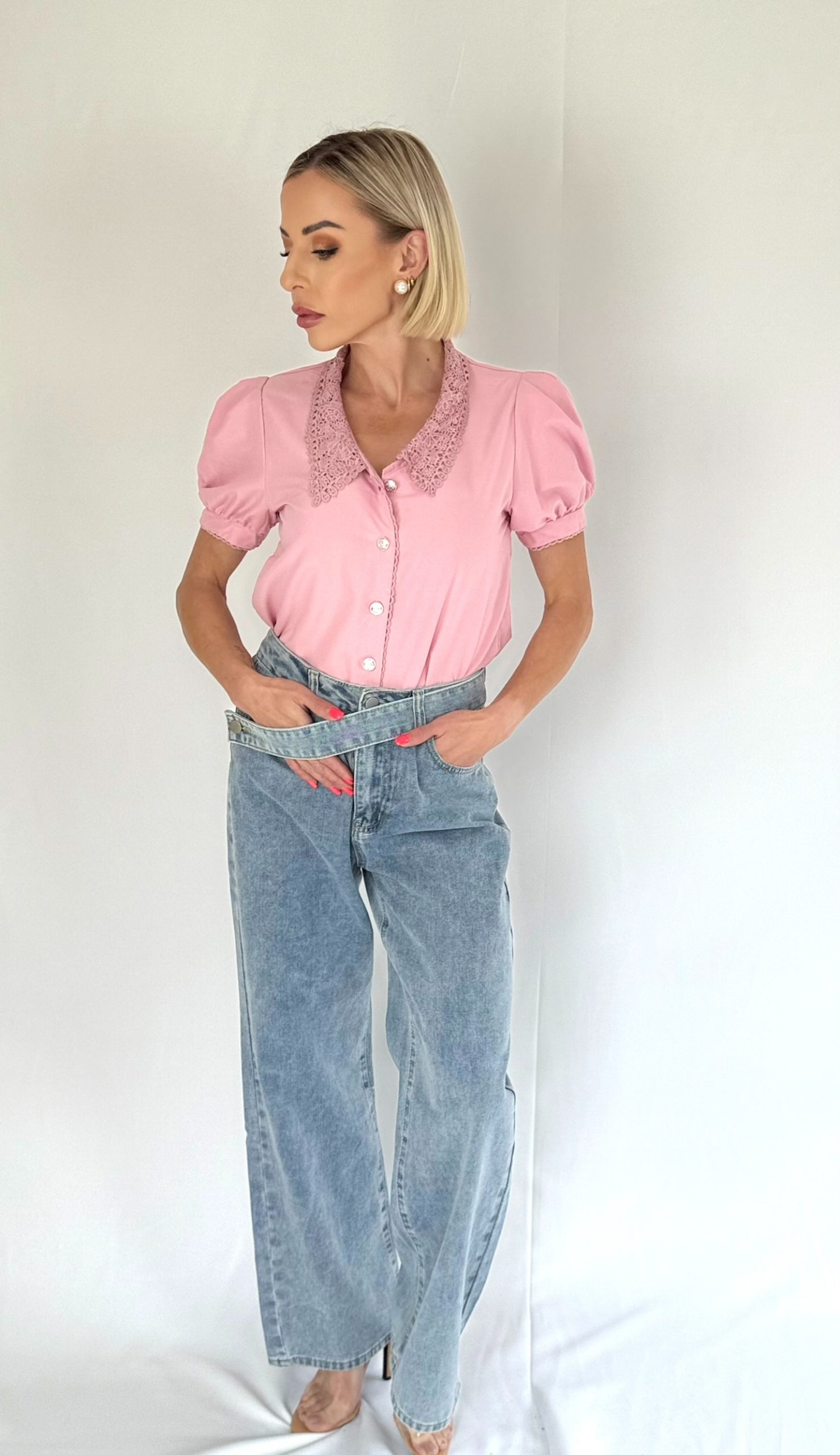 Asymmetrical waist belt with slant pockets in light washed jean color. Zipper fly. Wide leg baggy style. Mid-waist. 85% Cotton. Model is wearing size XS. Model length is 1.58cm