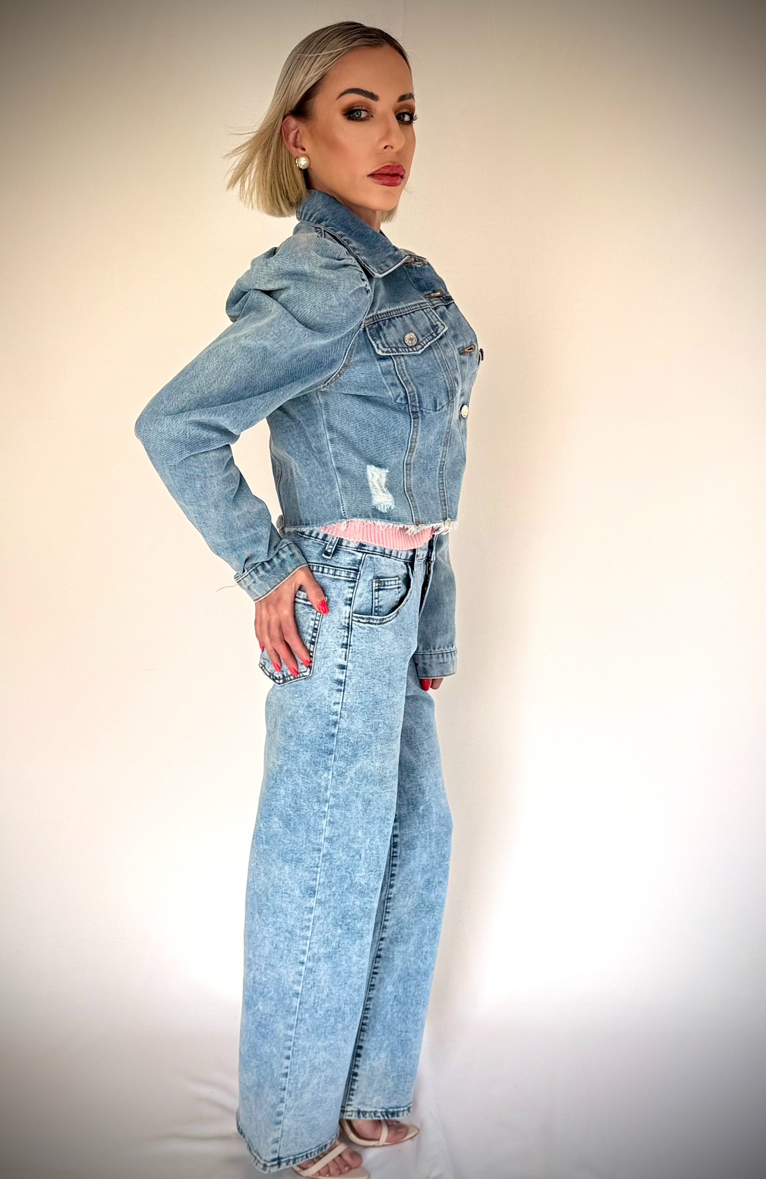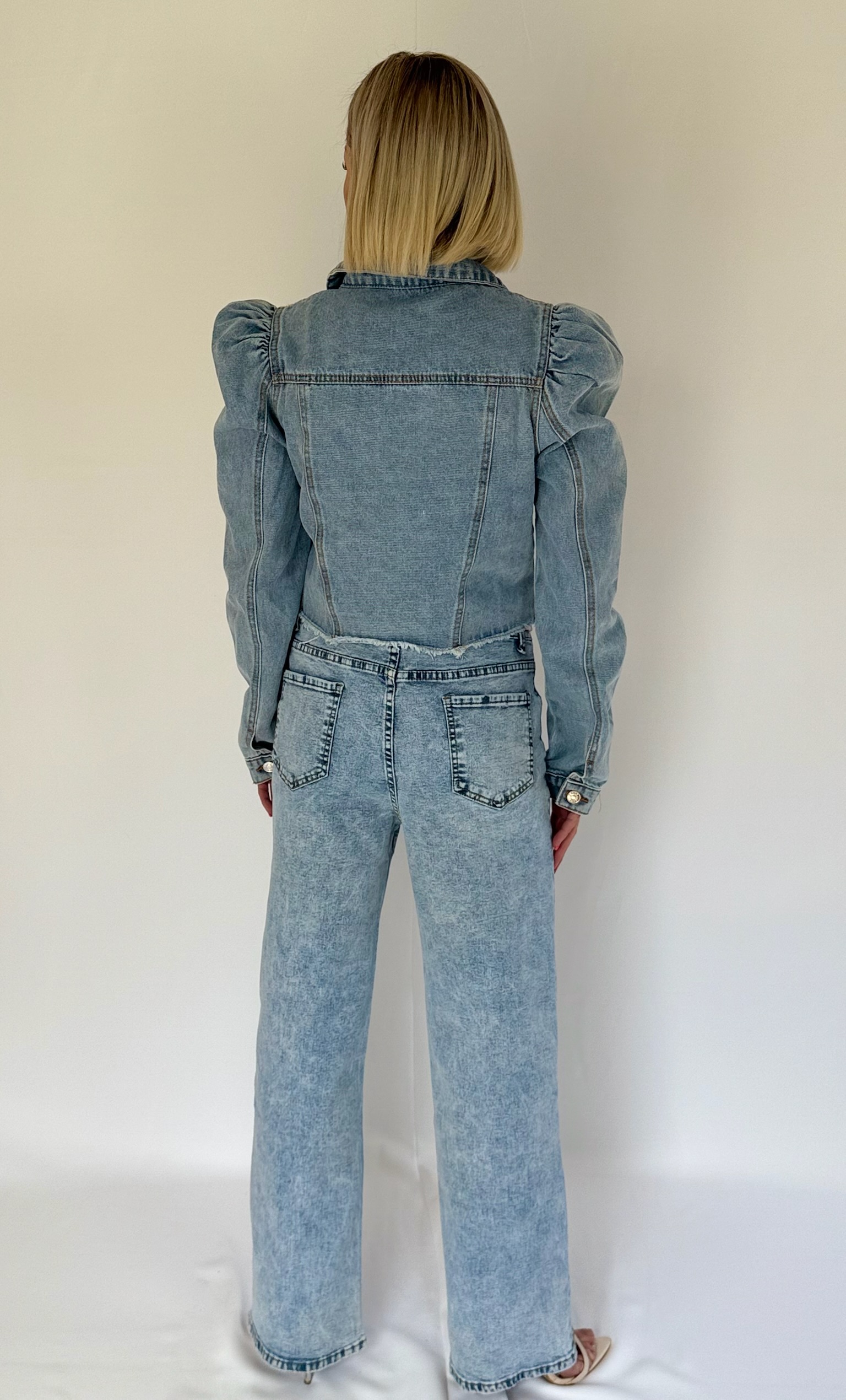 Puff sleeve style light jean jacket with collar cropped style. Elevate any casual outfit. Regular fit. Non-stretch. Model is wearing size S. Model length 1.58cm