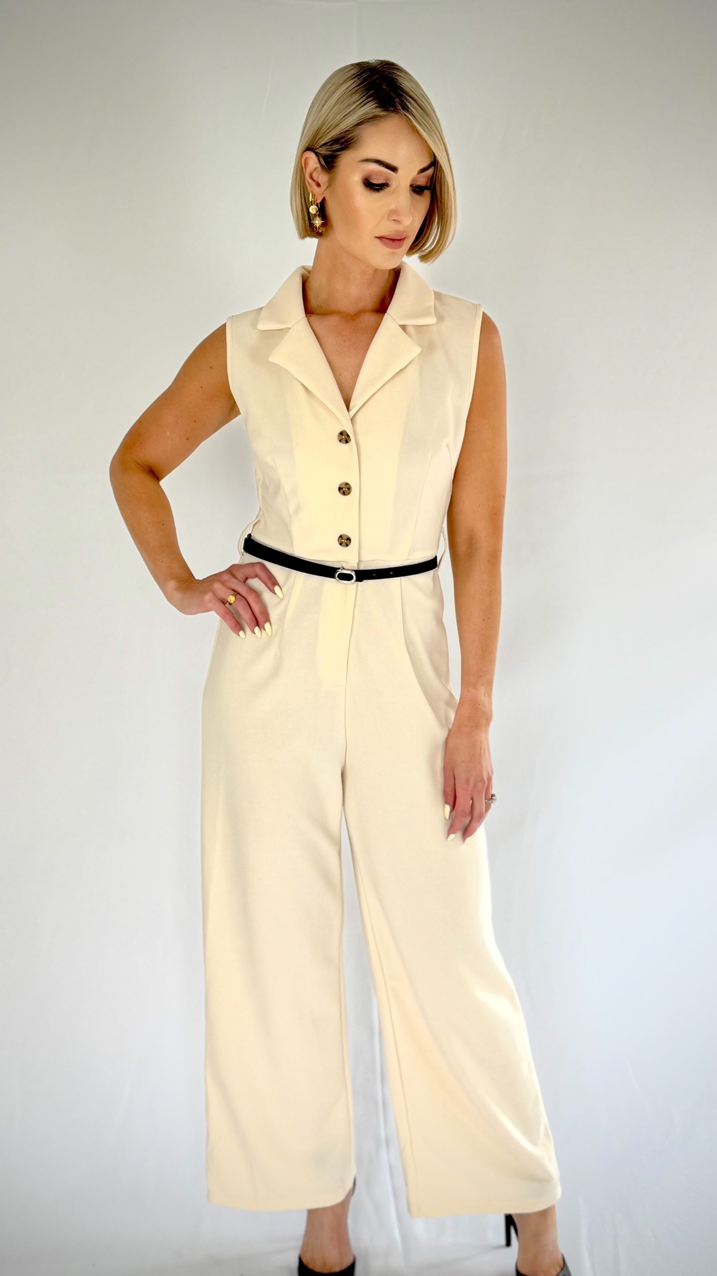 Knitted fabric with lapel neck line. Natural mid waist. Sleeveless. Perfect smart casual jumpsuit. Medium fabric stretch. Black slim belt included. Model is wearing size S. Model length 1.70cm