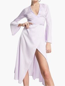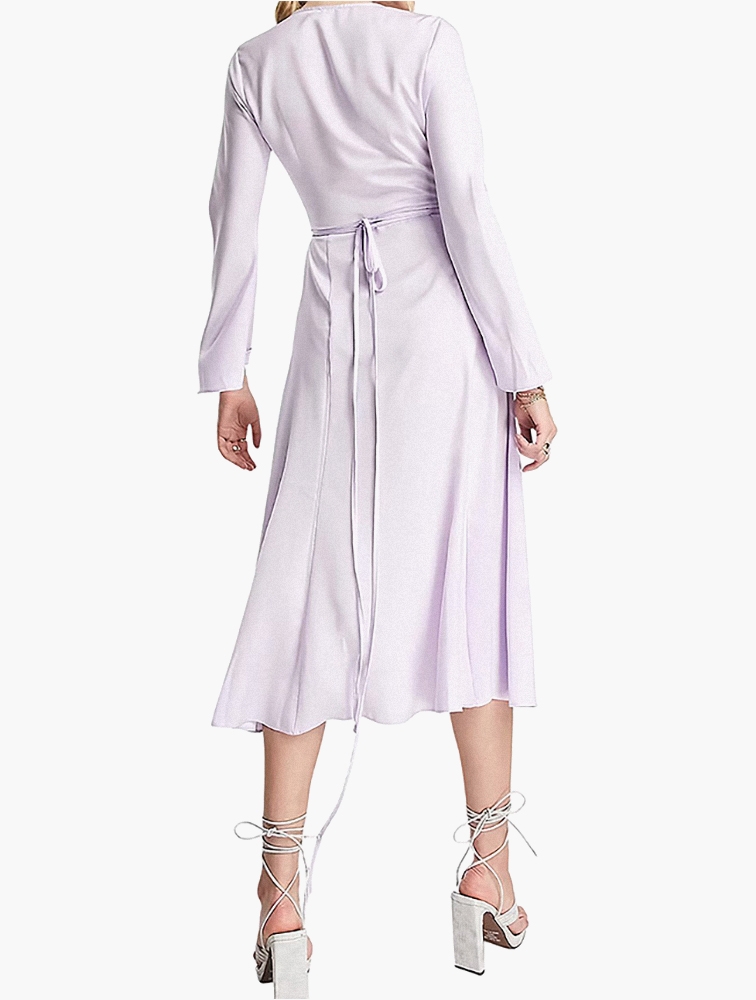 Lilac Tie Waist Bias Cut Satin Wrap Midi Dress
