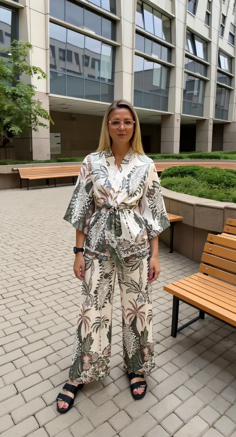 Tropical inspired outfit, comfortable, silky, soft and flowy, Kimono-style wrap top featuring botanical palm tree print