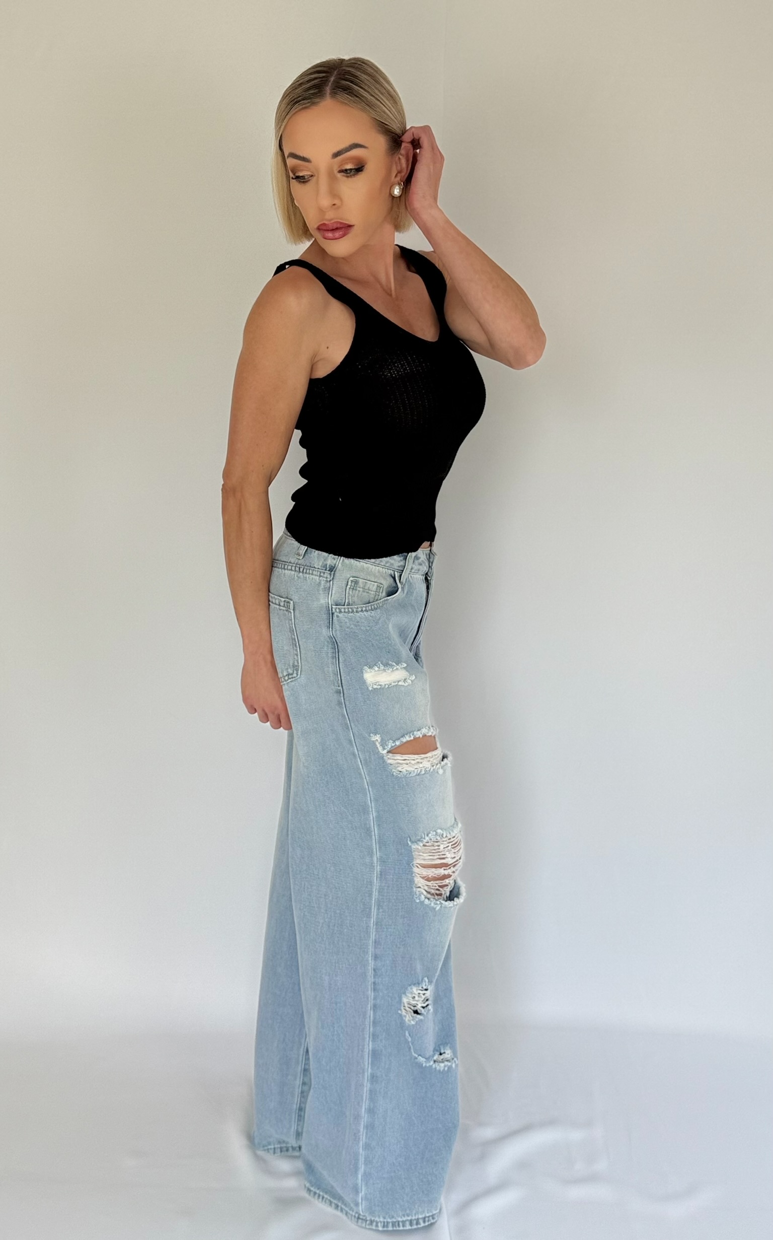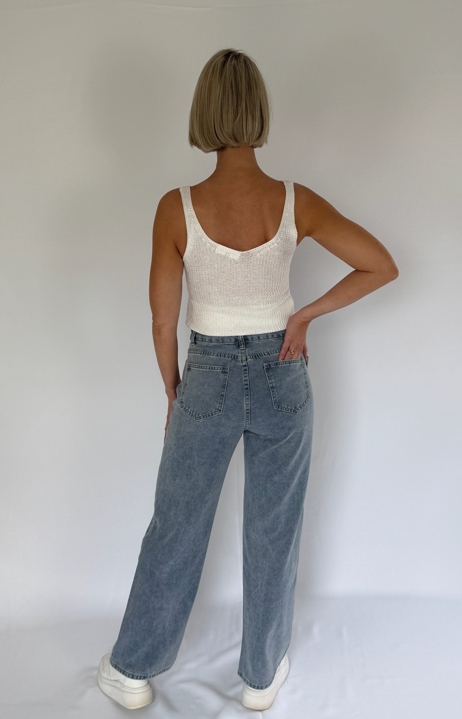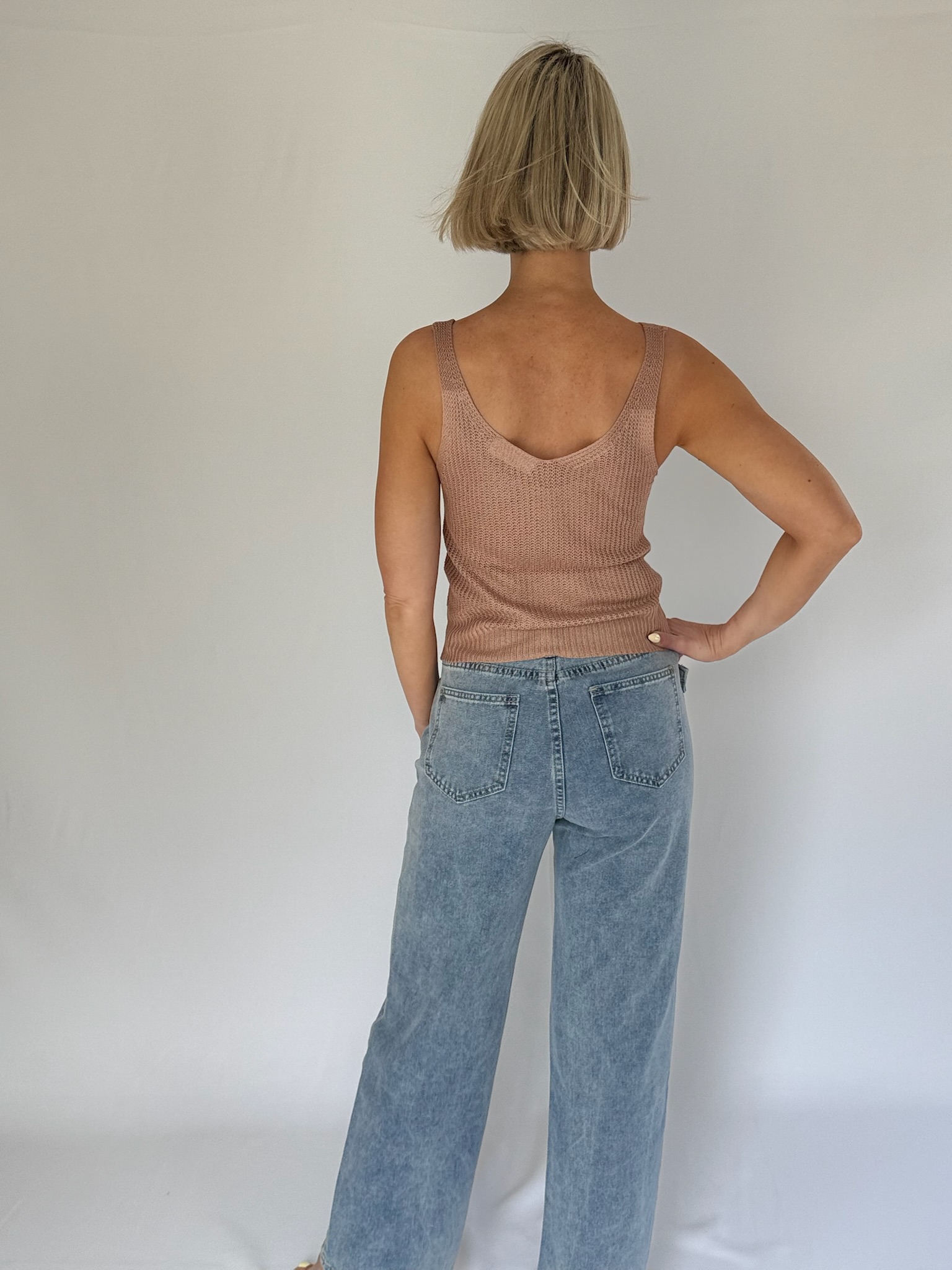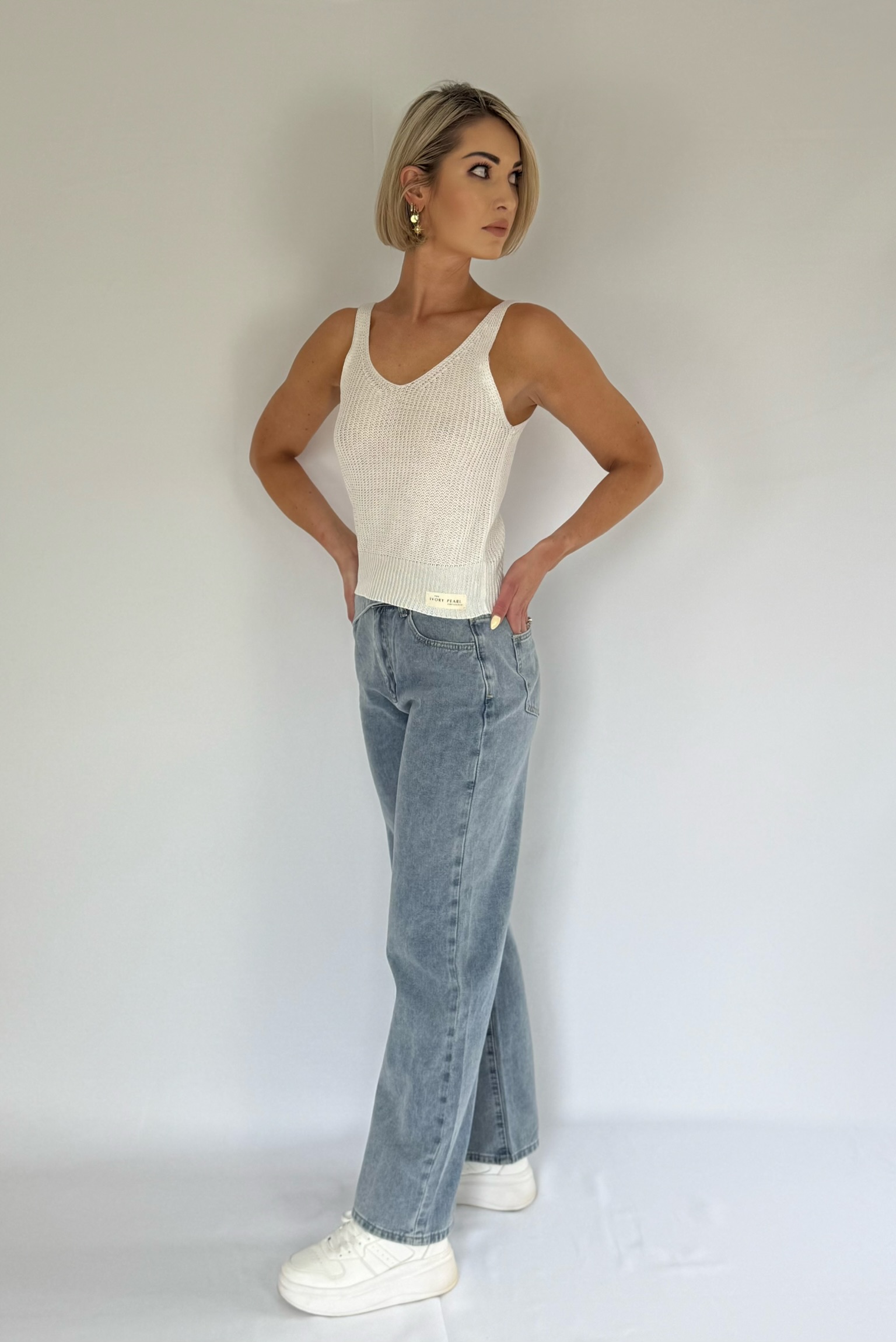 V neck knitted regular fit knitted top. Sleeveless. Non-stretch. Semi-sheer knit. Models are wearing size XS and S. Models length are 1.58cm and 1.70cm