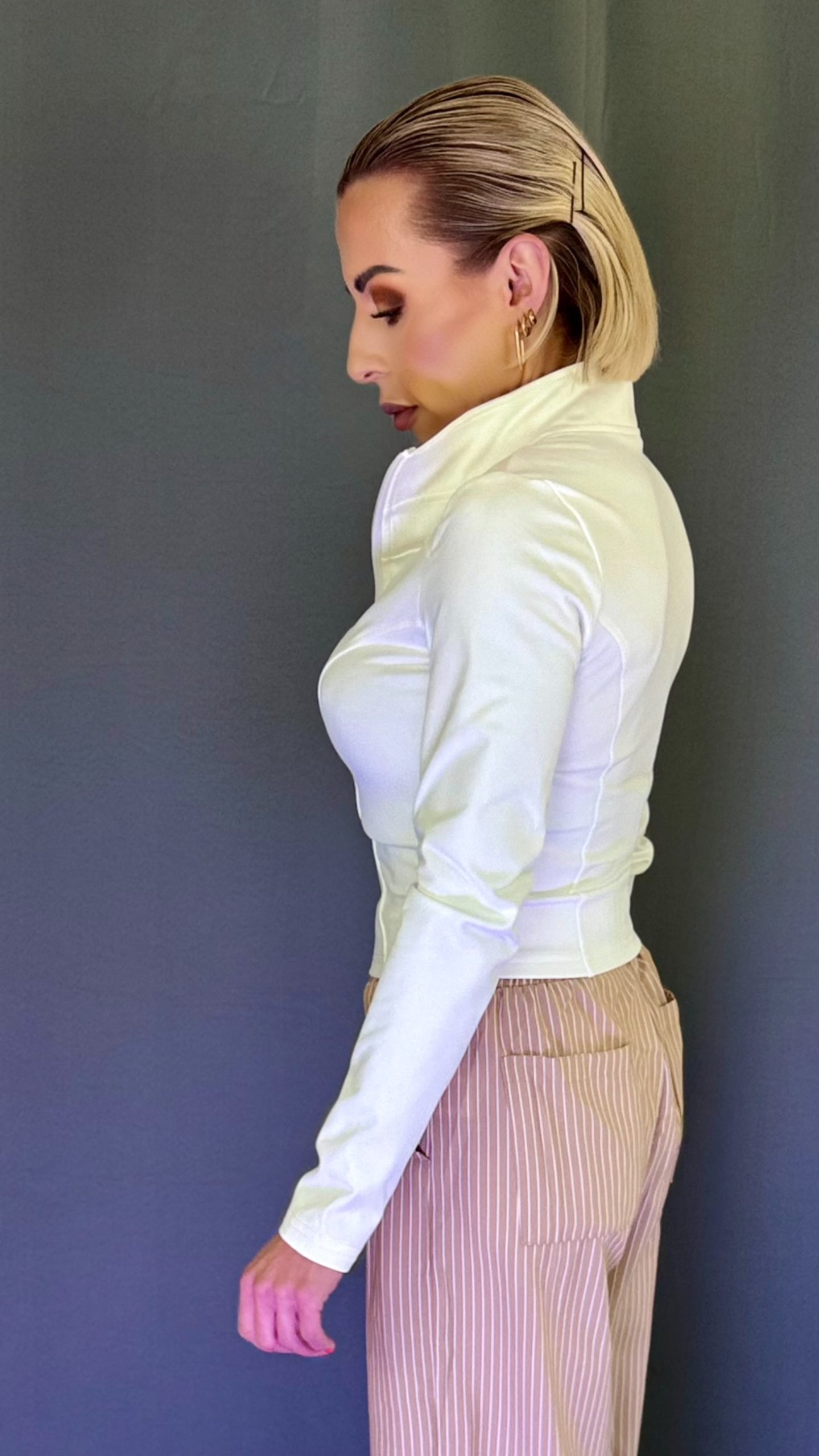 Long sleeve zip-up jacket perfect for sport activities or casual wear. Stand collar neckline. Asymmetrical hem shape. Regular fit. Medium stretch. Model is wearing size S. Model length is 1.58cm.